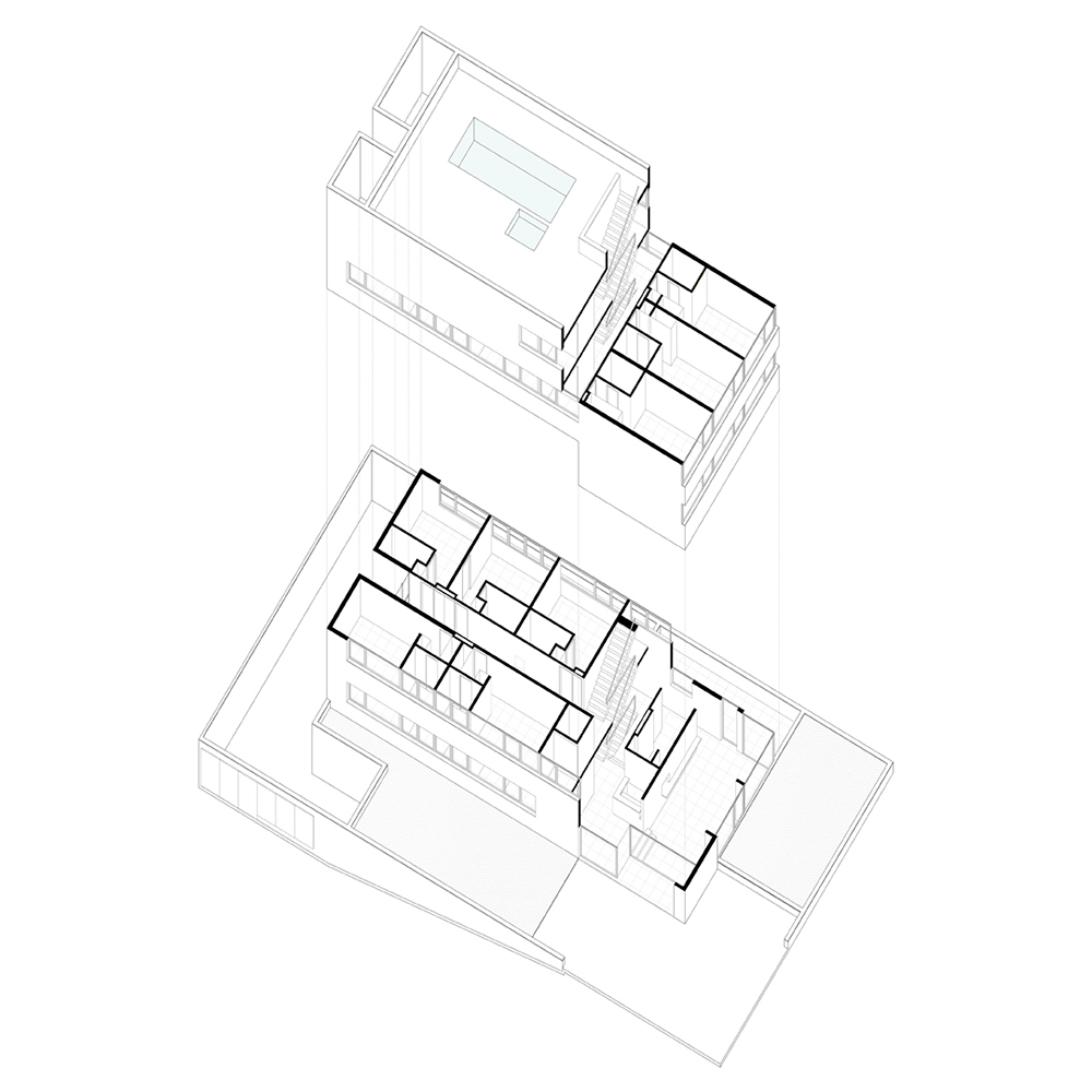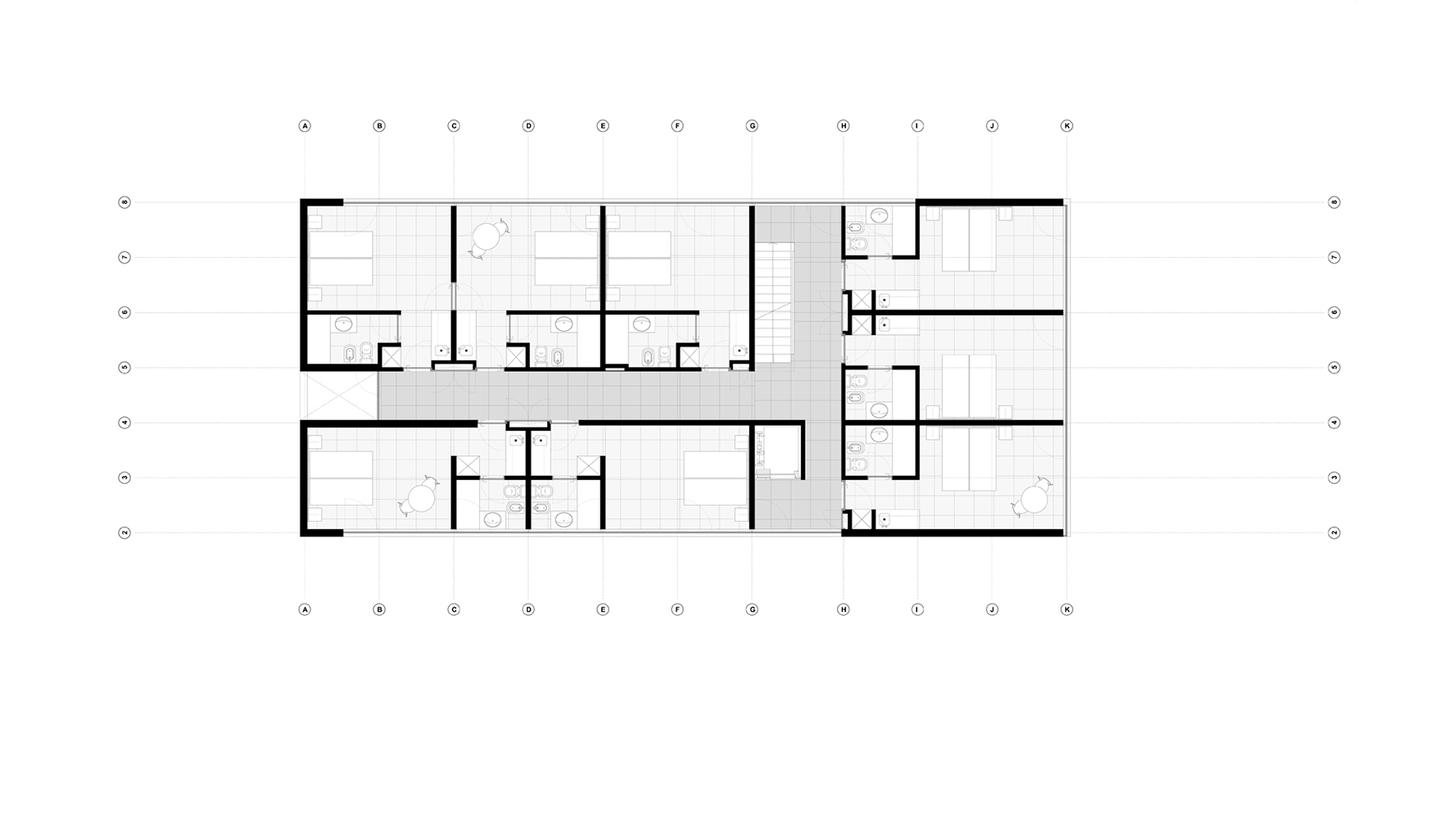 Un edificio de hotel, es un programa abandonado a la arquitectura de la piel, no hay programa con temas tan preestablecidos, de los cuales intentamos realizar investigaciones programáticas. Hemos definido una única unidad de habitación, que al natural baño, se sumó una kitchenet, que según la orientación, solo alteramos el programa de apoyo, logrando una variación de relaciones internas en la propia habitación, como así en las relaciones generales.