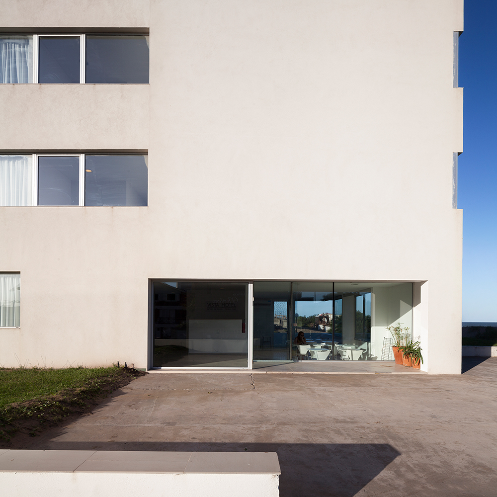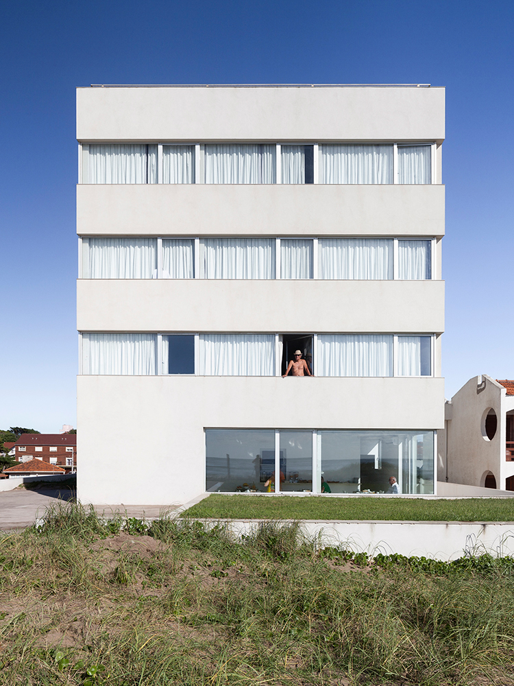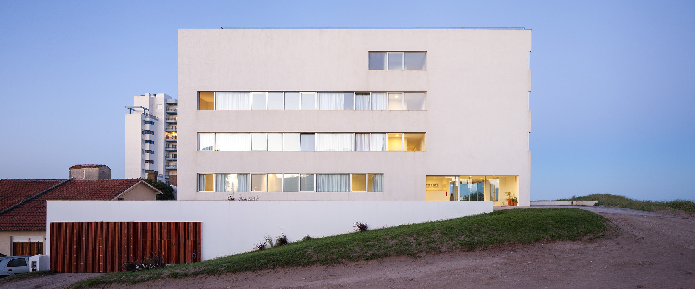 El edificio se presenta, con el basamento a modo de proa, avanzando sobre la pendiente, sobre la cual recae la responsabilidad de la presencia notoria del hotel desde el exterior, ubicamos el acceso en el lado opuesto, vinculado al mar, para luego tener una posición privilegiada sobre el entorno.